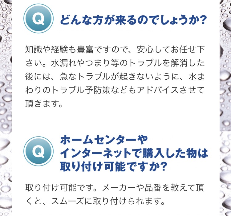 水漏れ 詰まり 蛇口 シングルレバー 単水栓 トイレタンク ボールタップ フロート レバー 止水栓 メーター 便器 和式 洋式 便座 ウォシュレット リモコン トイレつまり 排水つまり トイレに物を落とした 便器と床の間から水漏れ トイレの床下から水漏れ 便器交換 トイレリフォーム 洗面化粧台 三面鏡 洗髪シャワー 浄水器 お風呂 浴室 バスルーム 湯沸かし器 システムキッチン ユニットバス 給湯器 井戸ポンプ 深井戸 浅井戸 水中ポンプ ジェット 洗濯機 防水パン 移設 食器洗い乾燥機 食洗器 分岐 引っ越し TOTO INAX LIXIL KVK モエン サンエー 水が出ない お湯が出ない 水が止まらない 自分で対処法